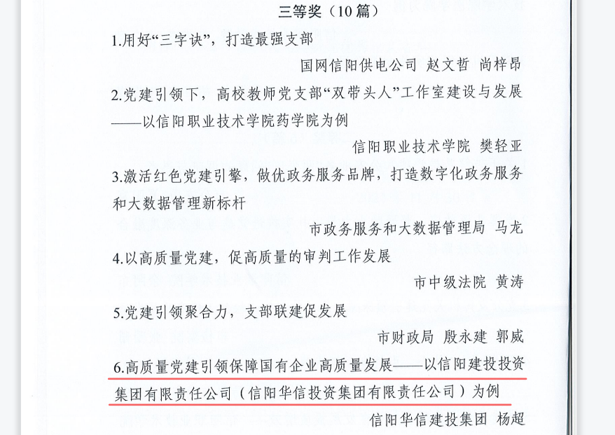 2022年11月30日,市直工委发布《关于对2022年度机关党建研究优秀成果进行表彰的通报》。通报中,华信建投集团党建研究课题《高质量党建引领保障国有企业高质量发展》荣获三等奖。据悉,此次活动中,经评委会认真评选,共有19篇征文入选。其中,一等奖3篇、二等奖6篇、三等奖10篇。
