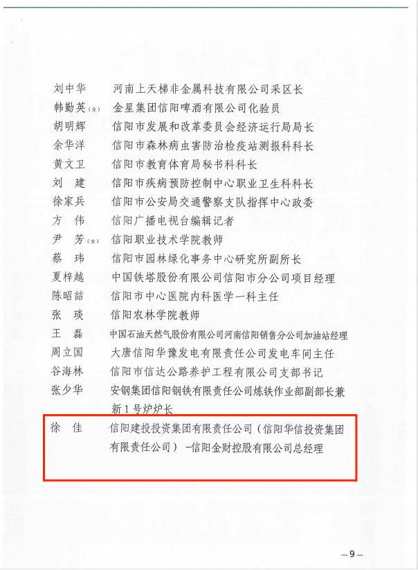 2023年4月27日,信阳市总工会发布《信阳市总工会关于表彰2023年信阳市五一劳动奖和信阳市工人先锋号的决定》。华信建投集团所属金财控股公司总经理徐佳荣获信阳市五一劳动奖章。