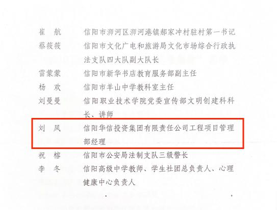 2023年5月4日,共青团信阳市委印发《关于表彰第10届“信阳青年五四奖章”和“信阳青年五四奖章集体”的决定》(信青联字﹝2023﹞6号)。华信建投集团工程项目管理部经理刘凤荣获“信阳青年五四奖章”。