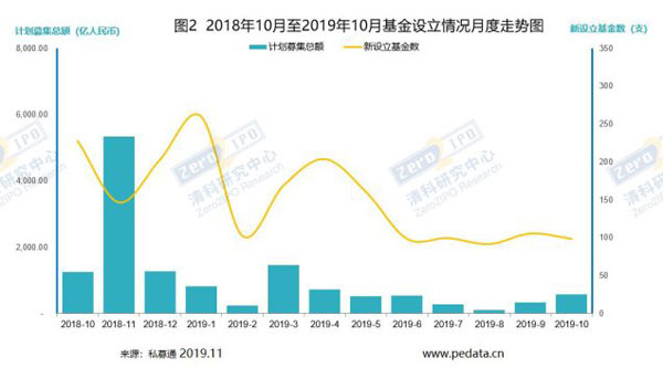 据清科研究中心旗下私募通统计显示:2019年10月国内股权投资募资市场共计151支基金发生募集,数量同比上升28.0%,环比下降15.2%;披露募资金额的142支基金共募集855.00亿元人民币,同比上升22.9%,环比上升43.7%。新设立基金共计99支,数量环比下降6.6%;披露目标规模的基金22支,计划募资584.63亿元人民币,较上个月环比上升79.0%。10月份新募集基金数量呈下降趋势,新设立基金的数量没有明显的波动,新募集和新设立金额方面都有小幅回升,其中,新设立计划募资金额9月份和10月份连续保持小幅回升态势。总体来看, 10月份募资市场持续低位运行,由于头部募资金额较大,募资金额小幅回升,但整体表现平平,尚无回暖趋势。
